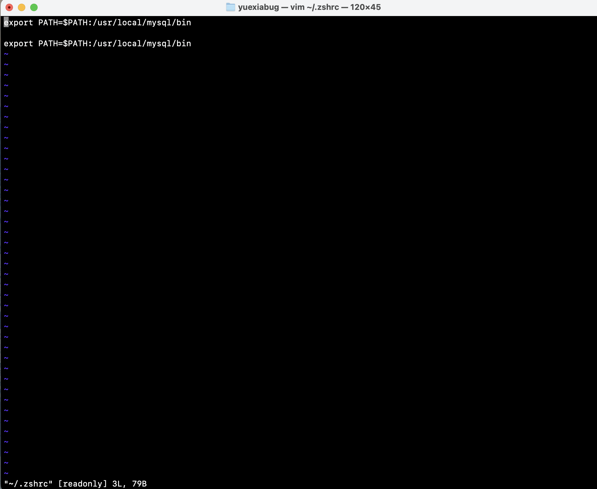 在终端中输入 vim ~/.zshrc,打开 ~/.zshrc 文件。