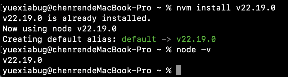接着就是选择自己需要的版本进行安装,比如我选择安装最新的 LTS 版本 v22.19.0,则输入以下命令: